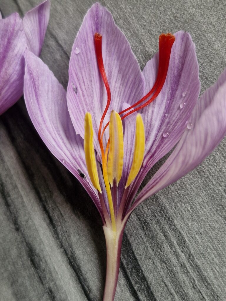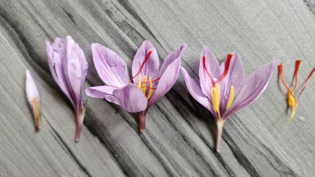 Début de la récolte du Safran. L’an passé, tous les bulbes ont pourris en raison des pluies continues de l’été. Après plantation de nouveaux bulbes cet été, j’espère obtenir suffisamment de filaments pour satisfaire les clients qui les attendent avec impatience. Je croise les doigts.